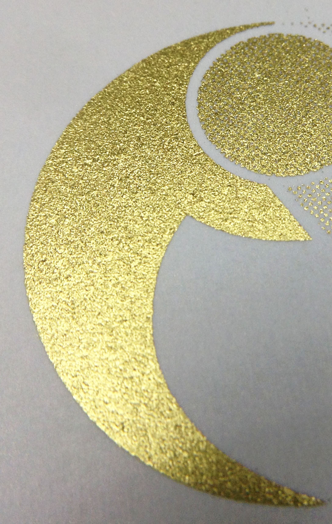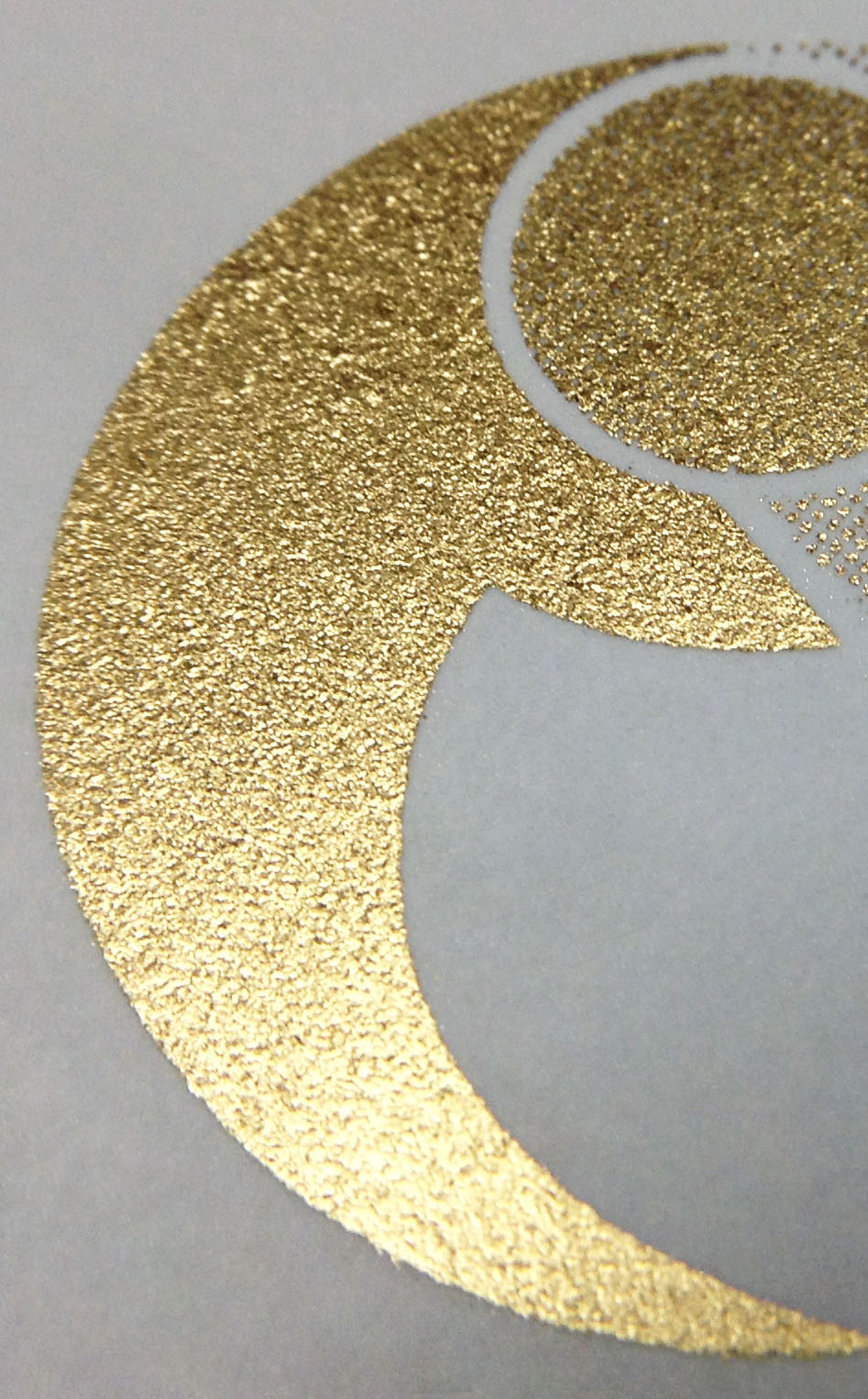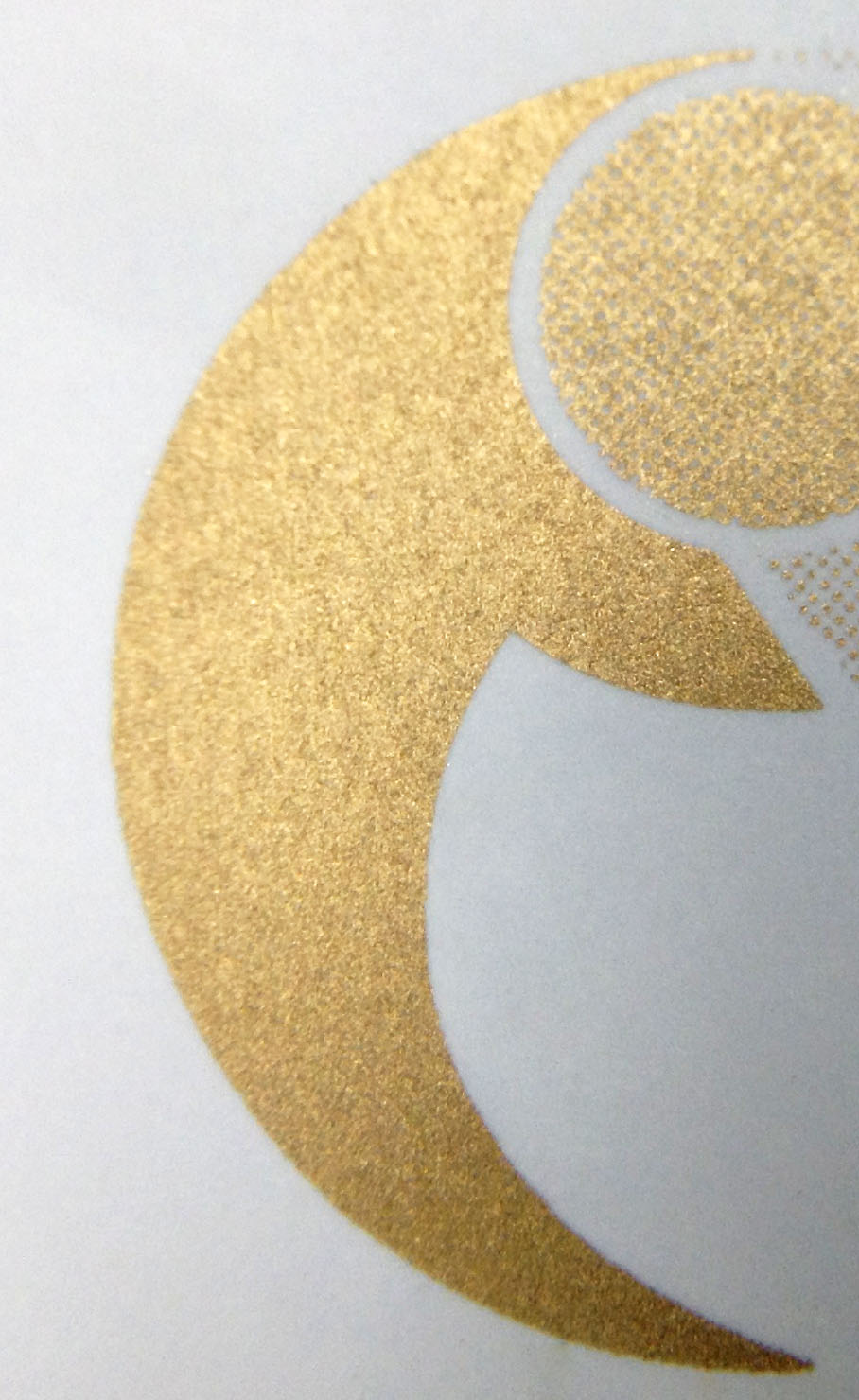 この方法を使った金刷りは、極小ロットに限られるものの、発色の良い金色を実現できます。しかも、平滑でない紙でも色の紙であっても構わないのです。結局、金とは色ではなく結晶質の鉱物の反射であり金属光沢なので、インキベース(ビヒクル)に真鍮や銅、亜鉛などの鉱物を混ぜ合わせたインキであり、DICのレギュラーインキと違うのは、金粉の成分とメッシュの大きさだと思います。通常印刷用が0.001ミリ以下の粒のところ、当社スクリーン印刷では0.01ミリを使用しています。(下手な撮影ですが、写真参照)